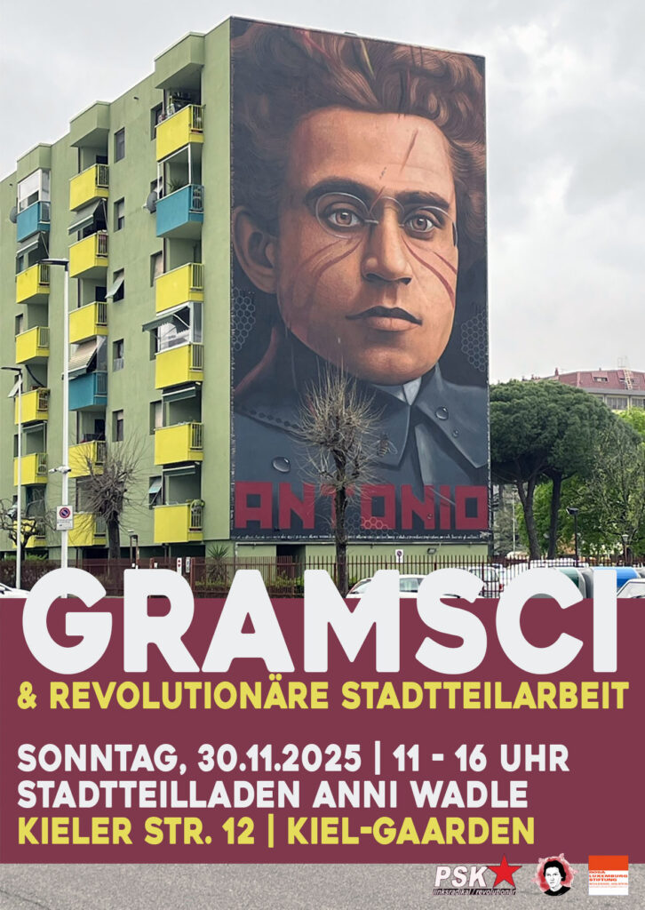 In dem Workshop werden wir uns im ersten Teil mit den zentralen Begriffen der Theorie Antonio Gramscis auseinandersetzen und schauen, wie diese für die politische Arbeit im Stadtteil produktiv gemacht werden können. Im zweiten Teil werden wir kurz die Arbeit des Stadtteilladen Anni Wadle vorstellen, mittels dem seit Herbst 2022 versucht wird über lokale Basisarbeit eine Strategie gegen den zerstörerischen Kapitalismus zu entwickeln. Anschließend wollen wir gemeinsam analysieren, wie ausgehend von der Theorie und den gemachten Erfahrungen eine konkrete Praxis für revolutionäre Stadtteilarbeit in Gaarden aussehen kann.