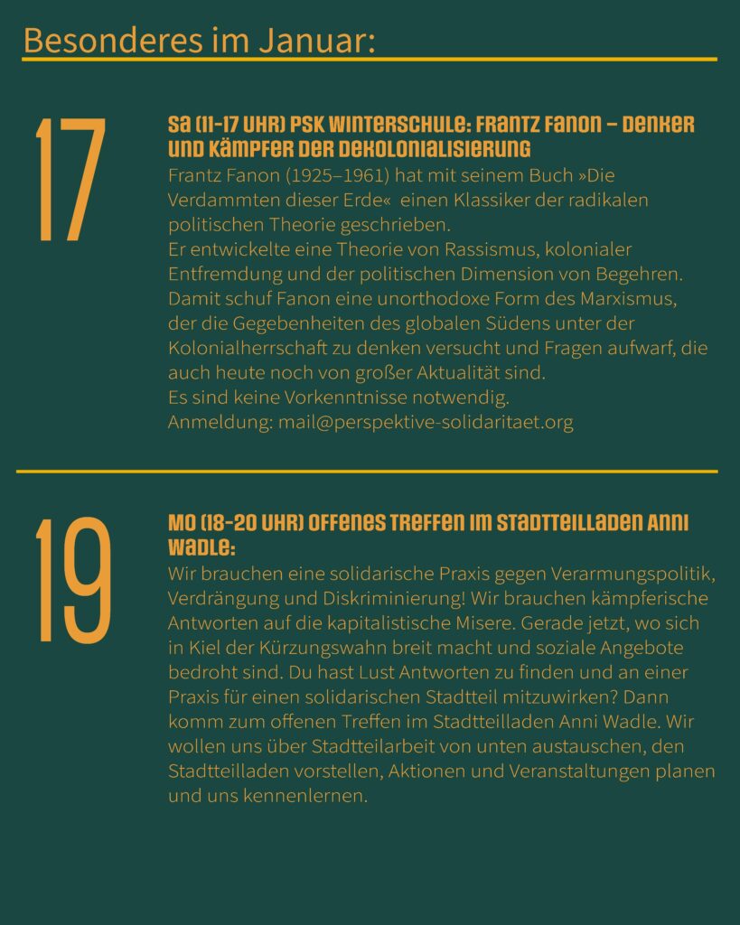 Samstag, den 17. Januar von 11-17 Uhr lädt Perspektive Solidarität Kiel zur Winterschule: Frantz Fanon – Denker und Kämpfer der Dekolonisierung! Vorkenntnisse sind nicht notwendig, eine Anmeldung aber schon.