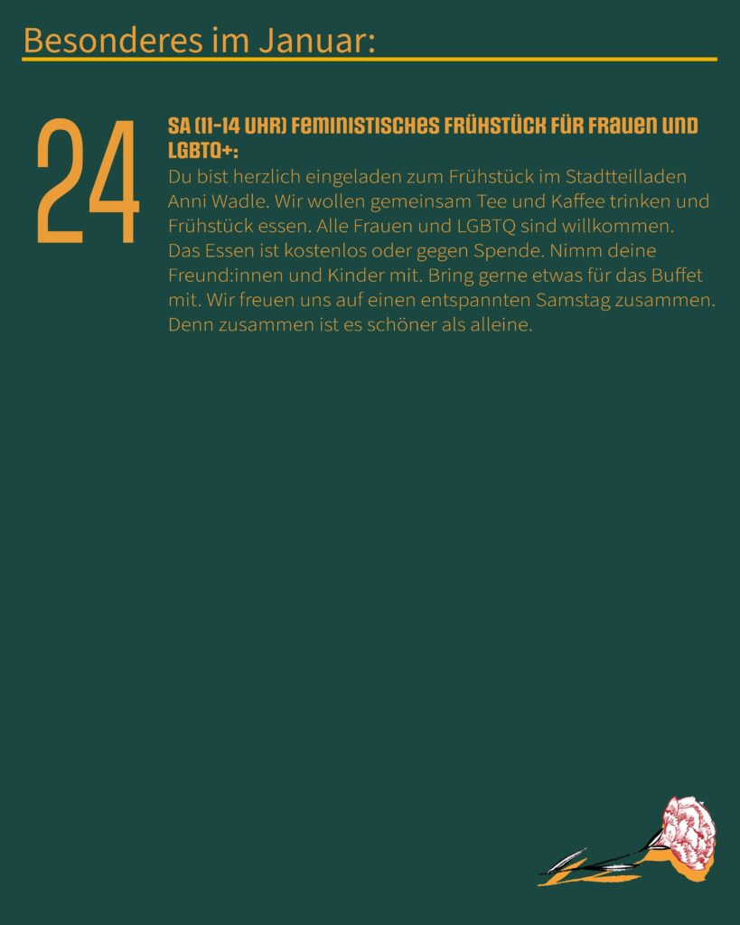 Samstag, den 24. Januar von 11-14 Uhr findet ein feministisches Frühstück im Stadtteilladen statt. Alle Frauen und LGBTIQ+ sind herzlich willkommen!