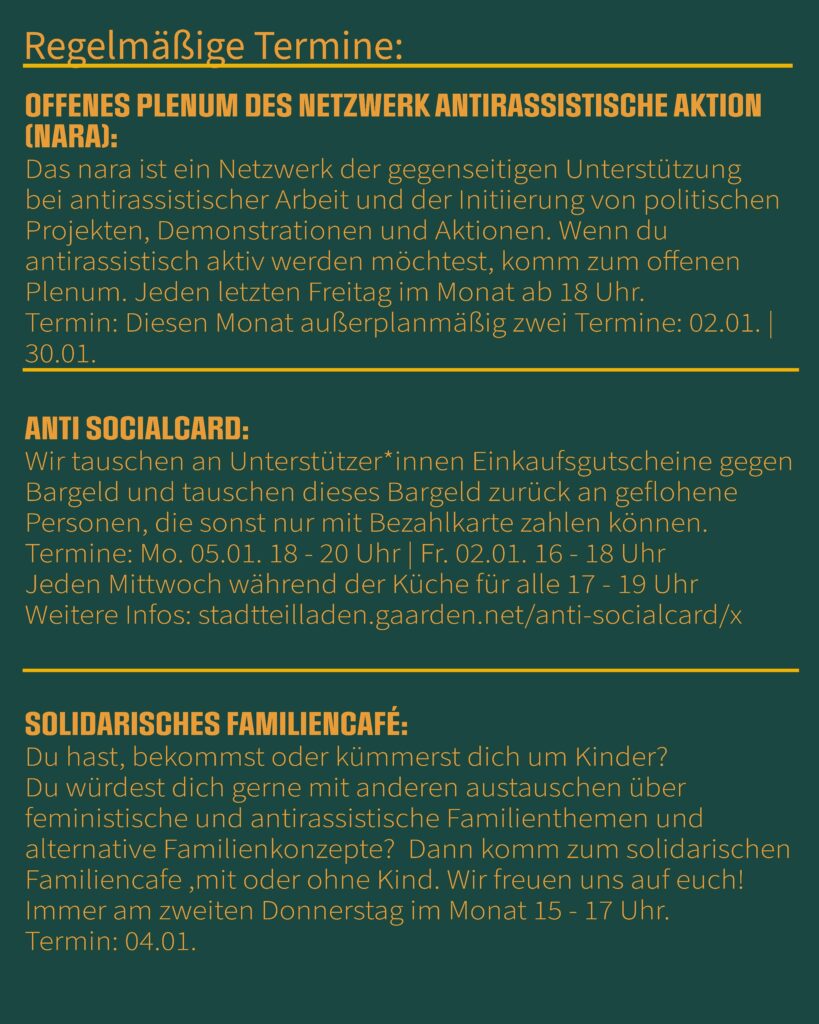 Bei Problemen mit Vermieter*in, Nebenkosten, Arbeit, Jobcenter, Amt o.ä. hilft euch die Solidarische Beratung dienstags 16-18 Uhr und am Mittwoch, den 14. Januar 16-18 Uhr und am Freitag, den 23. Januar 16-18 Uhr.